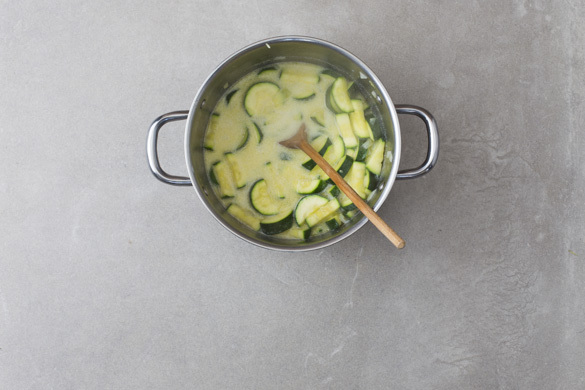 Die Zucchini, die Zwiebeln, den Knoblauch und die Chili nach Geschmack in einem großen Topf mit 2EL Olivenöl bei mittlerer Hitze ca. 2Min. leicht anschwitzen. Mit 1 kräftigen Prise Salz würzen und abgedeckt 10–15Min. garen, bis die Zucchini weich sind. Ggf. die Temperatur reduzieren, damit das Gemüse nicht anbrennt.