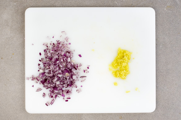 Die Zwiebeln schälen und fein würfeln. Den Ingwer schälen und fein reiben.