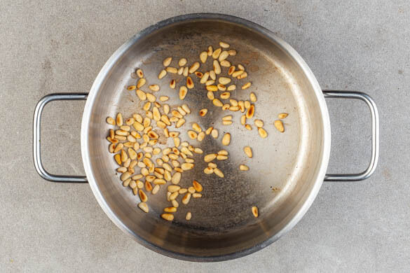 Die Pinienkerne in einem mittelgroßen Topf ohne Zugabe von Fett bei mittlerer Hitze in 2–4Min. goldbraun anrösten. Vorsicht, sie können schnell zu dunkel werden. Zum Abkühlen aus dem Topf nehmen und beiseitestellen.