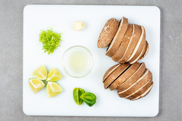 Den Backofen mit Grillfunktion oder Ober-/Unterhitze auf 250°C vorheizen. Die Stiele entfernen und die Pilze in ca. 1cm dicke Scheiben schneiden. Den Knoblauch schälen. Die Chilischote halbieren, Kerne und Stiel entfernen. Die Limettenschale abreiben und die Limette halbieren, eine Hälfte auspressen, die übrige Hälfte in Spalten schneiden.