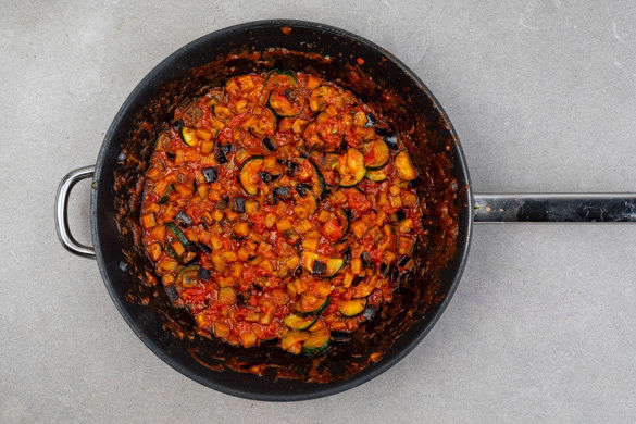 Den Backofen auf 220°C Umluft (240°C Ober-/Unterhitze) vorheizen. Die Aubergine in ca. 1cm kleine Würfel schneiden. Die Zucchini längs halbieren und in dünne Scheiben schneiden. Das Gemüse in einer großen Pfanne mit 1EL Olivenöl und 1 Prise Salz bei starker Hitze 3–4Min. goldbraun anbraten.
