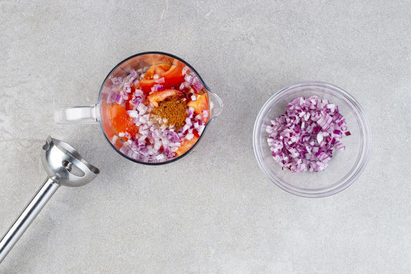 Die Tomaten vierteln. Die Zwiebel schälen, halbieren und in feine Würfel schneiden. Die ½ der Zwiebeln mit den Tomaten, 2EL Olivenöl und ½TL Salz in einem hohen Gefäß mit einem Stabmixer fein pürieren. Mit der Gewürzmischung abschmecken und die Salsa bis zum Servieren kalt stellen.