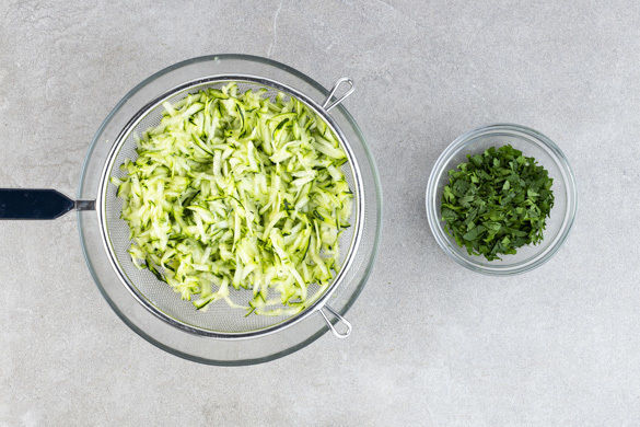 Die Zucchini mit einer Küchenreibe grob raspeln, anschließend in einem Sieb möglichst viel Flüssigkeit herausdrücken. Die Petersilie samt Stängeln fein hacken.