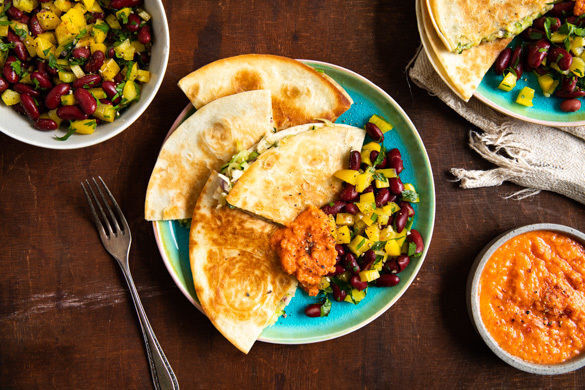 Die fertigen Quesadillas mit einem scharfen Messer in Viertel schneiden, mit dem Bohnensalat und der Salsa anrichten und servieren. Tipp: Sollte Füllung übrig bleiben, kann diese zum Frühstück mit 2–3 Eiern verquirlt als leckeres Omelett zubereitet werden.