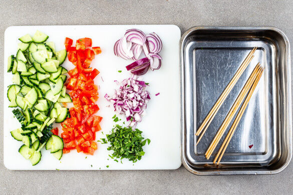 Falls verwendet, den Grill vorheizen. 16 Schaschlikspieße in Wasser einweichen. Die Zwiebeln schälen und halbieren, zwei Hälften in ca. 1,5cm breite Spalten schneiden, die anderen Hälften fein würfeln. Die Gurke längs vierteln und quer in dünne Scheiben schneiden. Die Tomaten in ca. 1cm große Würfel schneiden. Den Koriander samt Stängeln fein schneiden.
