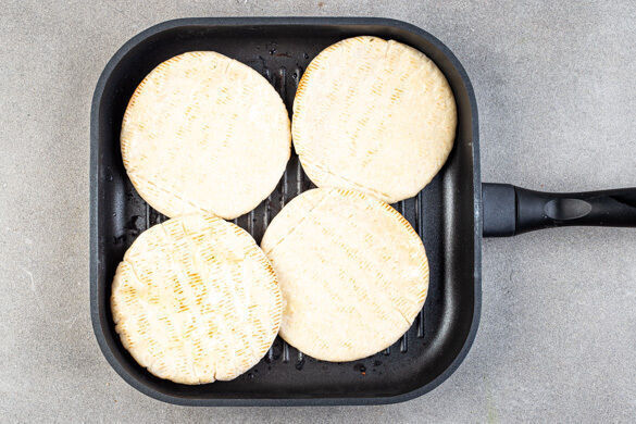 Inzwischen die Pitabrote mit insgesamt 2EL Olivenöl bepinseln. Wenn die Spieße fertig sind, die Brote auf dem Grill oder in der Grillpfanne auf jeder Seite ca. 1Min. erwärmen. Die Grillkäsespieße mit dem Tomaten-Gurken-Salat, dem Dip und dem Pitabrot servieren.