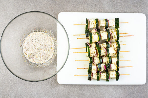 Die Zwiebelspalten, den Grillkäse und die Zucchini mit dem Würzöl vermengen, dann abwechselnd auf die Schaschlikspieße ziehen. Das übrige Würzöl mit der restlichen Gewürzmischung und 2EL Mayonnaise zu einem Dip verrühren.