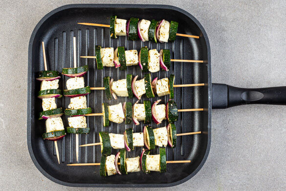 Grillkäse ist ja sowieso schon Stammgast in unserer Feierabendküche, aber aufgespießt und frisch vom Grill schmeckt er einfach noch ein bisschen besser. Okay, die Pfanne tut es natürlich auch – draußen essen kann man ja trotzdem. Der Grillkäse bekommt auf den Spießen Gesellschaft von Zucchini und Zwiebeln, als weitere Partygäste gesellen sich ein Tomaten-Gurken-Salat und knusprig geröstete Pitabrote dazu. Eine launige Runde!