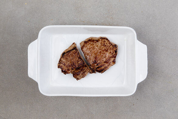 Das Fleisch mit etwas Küchenkrepp trocken tupfen und in einer großen Pfanne mit 1EL Olivenöl bei starker Hitze auf jeder Seite ca. 1Min. scharf anbraten. Mit Salz und Pfeffer würzen, in eine kleine Auflaufform geben und 5–7Min. im Ofen weitergaren. Das Fleisch sollte in der Mitte noch rosa sein. Bis zum Servieren ruhen lassen.