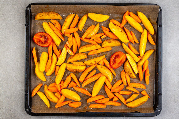 Die Kartoffeln, die Karotten und 4 Tomatenspalten auf einem mit Backpapier ausgelegten Backblech verteilen, dann mit der ½ der Gewürzmischung, der ½ des Paprikapulvers, 1EL Olivenöl sowie je 1 Prise Salz und Pfeffer vermengen. Das Gemüse im Ofen 20–25Min. backen, bis es gar und appetitlich gebräunt ist.
