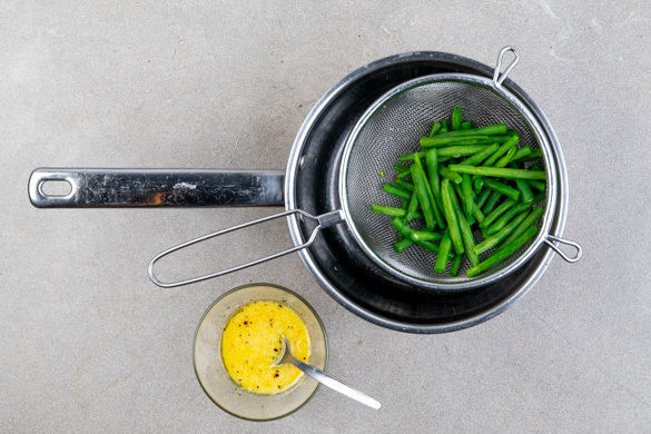 In einem mittelgroßen Topf ausreichend gesalzenes Wasser für die Bohnen zum Kochen bringen. Die Enden der Bohnen abschneiden, die Bohnen in das kochende Wasser geben und ca. 4Min. blanchieren, dann abgießen und kalt abschrecken. Aus 3EL Olivenöl, 2EL Essig, 2TL Senf sowie Salz, Pfeffer und 1–2 Prisen Zucker ein Dressing anrühren.