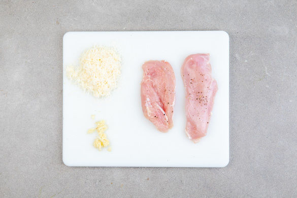 Den Knoblauch schälen und fein reiben oder durch eine Knoblauchpresse drücken. Den Käse fein reiben. Das Fleisch mit etwas Küchenkrepp trocken tupfen, jeweils horizontal zu 2 Schnitzeln halbieren und mit Salz und Pfeffer würzen.