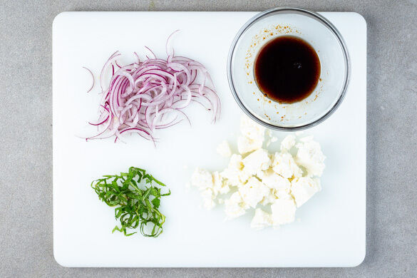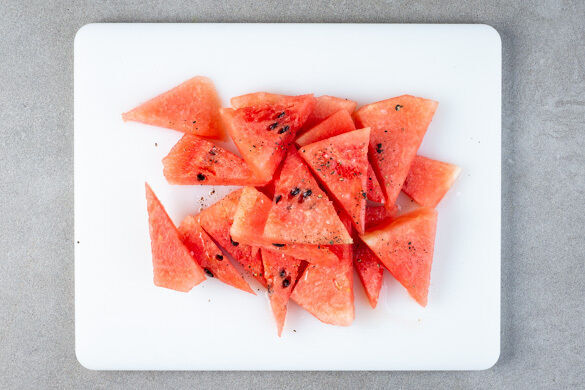 Die Melonenstücke ggf. portionsweise in die Pfanne geben und auf jeder Seite 1–2Min. grillen, bis sich Grillspuren abzeichnen. Aus der Pfanne nehmen und beiseitestellen.