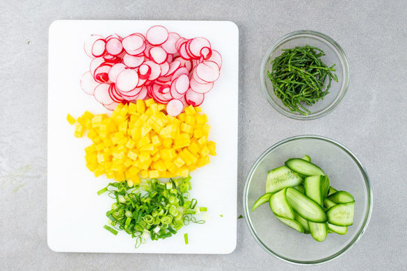 Die Radieschen in dünne Scheiben schneiden. Die Mangos schälen und das Fruchtfleisch in kleine Würfel schneiden. Möglichst viel Flüssigkeit aus den Gurkenstreifen auspressen und die Gurken mit dem Sesamöl und 2EL hellem Essig vermengen.