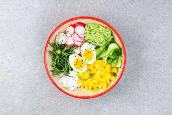 Eine bunte Bowl zum Sattsehen und -essen: Auf leckerem Sushireis ergänzen sich als feine Toppings cremige Guacamole, fruchtige Mangostückchen, knackige Radieschen und Gurke sowie ein wachsweich gekochtes Ei. Garniert mit geröstetem Sesam bleiben keine Wünsche offen. Lass es dir schmecken!
