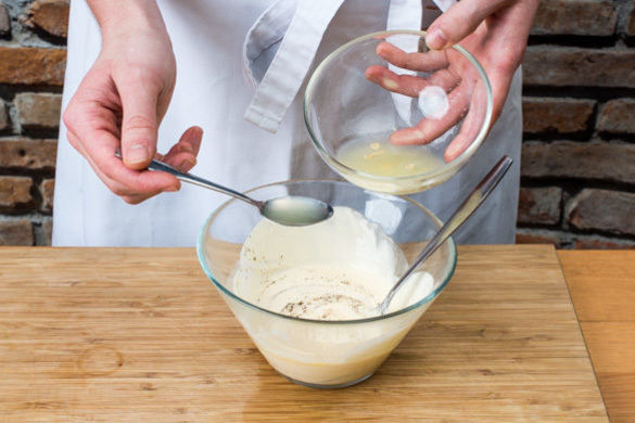 Die Zitrone halbieren und eine Hälfte auspressen, die andere Hälfte in Spalten schneiden. 1 Ei trennen und die Crème fraîche mit dem Eigelb verrühren. Mit Salz und Pfeffer sowie 1–2TL Zitronensaft abschmecken. Das Eiweiß wird für dieses Rezept nicht benötigt.