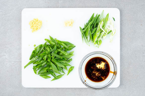 Die Bohnen in ca. 1cm breite Stücke schneiden. Den Ingwer schälen und fein reiben. Den Knoblauch schälen und ebenfalls fein reiben oder fein würfeln. Die Lauchzwiebel schräg in feine Ringe schneiden. Die 1/2 der Teriyakisauce mit der 1/2 des Reisessigs und der 1/2 des Ingwers oder mehr verrühren.