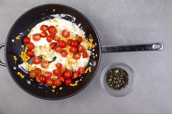Die Kürbiskerne in derselben Pfanne bei mittlerer bis starker Hitze ca. 2Min. anrösten, dann zum Abkühlen aus der Pfanne nehmen. Die Pfanne erneut erhitzen und den Mais und die Lauchzwiebeln mit 1–2EL Olivenöl bei niedriger Hitze ca. 3Min. leicht anbraten. Die Schlagsahne, die Tomaten und den Knoblauch vorsichtig unterrühren.