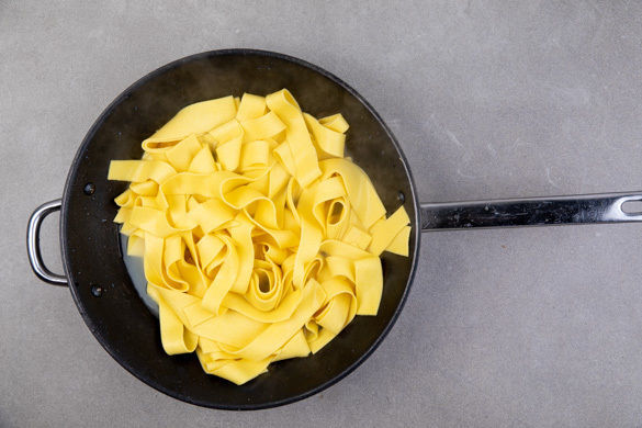 Die Lasagneblätter in ca. 1cm breite Streifen schneiden und in einer großen Pfanne mit ca. 1L heißem Wasser übergießen. Leicht salzen und die Pasta in 1–2Min. bei mittlerer Hitze bissfest garen. Mit einem Messbecher 100–150ml Pastawasser abschöpfen, dann die Pasta in ein Sieb abgießen und abtropfen lassen. Die Pfanne auswischen.