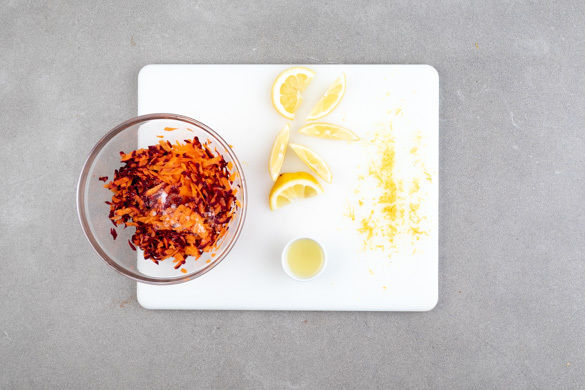 Ca. die 1/2 der Zitronenschale abreiben, dann die Zitrone halbieren und eine Hälfte auspressen, die andere Hälfte in Spalten schneiden. Die Karotten schälen und mit einer Küchenreibe grob raspeln. Mit 1TL Zitronensaft sowie Salz und Zucker abschmecken und ziehen lassen.