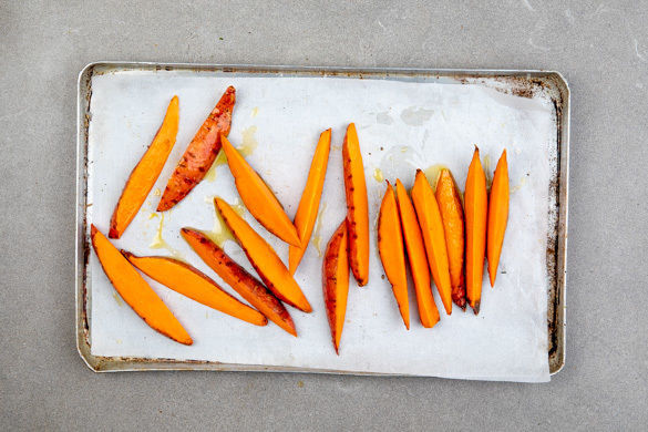 Den Backofen auf 220°C Umluft (240°C Ober-/Unterhitze) vorheizen. Die Süßkartoffeln nach Belieben schälen, dann längs halbieren und in 0,5–1cm dünne, pommesartige Stifte schneiden.