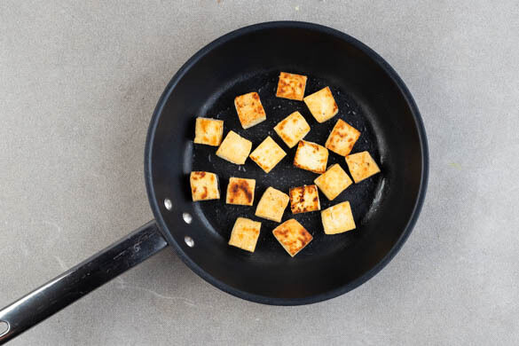 Den Tofu in einer mittelgroßen Pfanne mit 2EL Pflanzenöl bei starker Hitze in 5–7Min. rundum goldbraun anbraten.