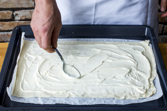 Den Teig mit dem Papier nach unten auf einem Backblech ausrollen und gleichmäßig mit der Crème fraîche bestreichen.