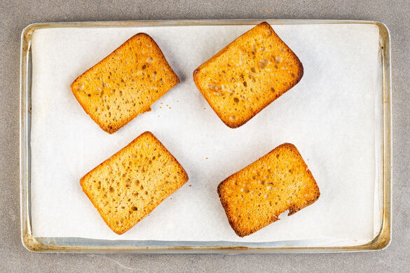 Die Brötchen aufschneiden, einmal quer halbieren und mit der Schnittfläche nach oben auf ein mit Backpapier ausgelegtes Backblech geben. Auf der obersten Schiene 1–2Min. im Ofen rösten, bis die Brötchen leicht goldbraun werden.