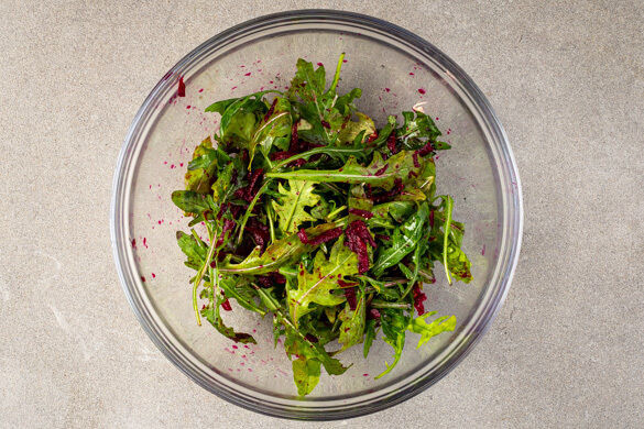 Die Rote Bete in ein Sieb abgießen, dann jede Brötchenhälfte mit 1–2EL Betestreifen garnieren. Die restliche Bete mit dem Rucola und 2TL Olivenöl vermengen, mit Salz und Pfeffer abschmecken und mit den Brötchen servieren.