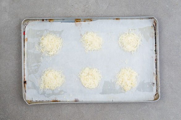 Den Käse fein reiben. Jeweils 1TL Käse auf einem mit Backpapier ausgelegten Backblech zu einem kleinen Haufen formen und diesen mit einem Löffel etwas flach drücken. Auf diese Weise 10–12 Käsetaler mit genügend Abstand zueinander auf das Backblech oder ggf. zwei Bleche geben und anschließend im Ofen 5–7Min. goldbraun backen. Aus dem Ofen nehmen und abkühlen lassen.