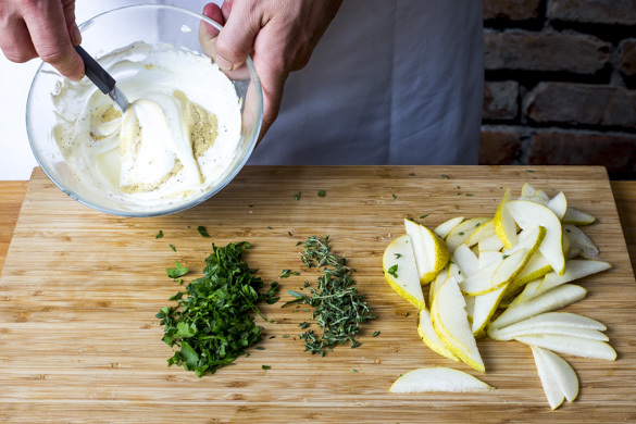 Die Crème fraîche mit 1EL körnigem Senf verrühren und mit Salz und Pfeffer abschmecken. Die Petersilie samt Stängeln fein hacken. Die Thymianblätter von den Stängeln streifen. Die Birne halbieren, entkernen und in dünne Scheiben schneiden.