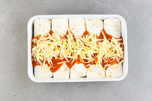 Die restliche Sauce mittig quer über den Enchiladas verteilen und mit dem restlichen Käse bestreuen. Die Enchiladas 5–10Min. im Ofen backen, bis der Käse geschmolzen ist. Mit den restlichen Lauchzwiebeln garnieren und servieren.