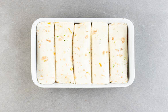 Eine ausreichend große Auflaufform mit 1EL Pflanzenöl fetten und 2–3EL Sauce gleichmäßig auf dem Boden der Form verteilen. 4–5 Tortillas mit der Füllung belegen, aufrollen und mit der Naht nach unten in die Auflaufform legen.