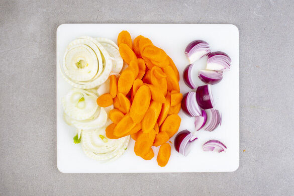Den Backofen auf 220°C (200°C Umluft) vorheizen. Den Fenchel quer in dünne Scheiben schneiden. Die Karotten ggf. schälen und schräg in dünne Scheiben schneiden. Die Zwiebeln schälen und halbieren und in breite Spalten schneiden.