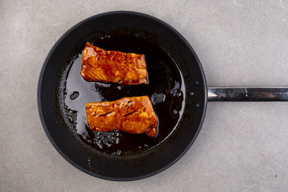 Die Teriyakisauce und 1EL hellen Essig in die Pfanne geben und bei mittlerer Hitze unter Rühren leicht eindicken lassen. Den Lachs mit der Hautseite nach unten in die Pfanne legen und die Teriyaki-Essig-Sauce darüberträufeln. Den Lachs in 1–2Min. fertig garen, samt Sauce aus der Pfanne nehmen und abgedeckt warm halten. Die Pfanne nicht auswischen.