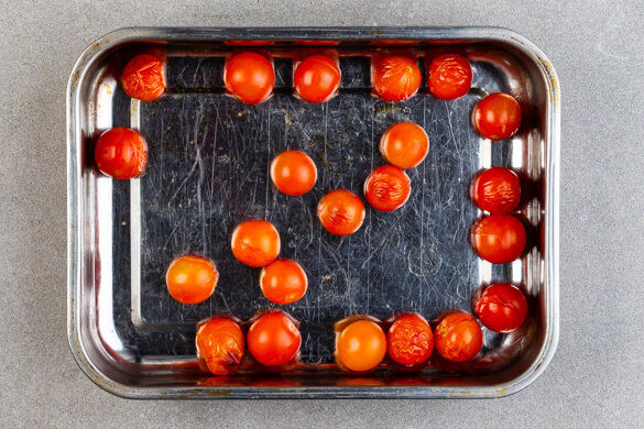 Die Kirschtomaten in eine kleine Auflaufform geben. Im Ofen 8–10Min. garen, bis sie stellenweise aufplatzen.