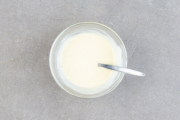 Den Knoblauch schälen. Die ½ des Knoblauchs fein reiben oder durch eine Knoblauchpresse drücken und mit 2EL Mayonnaise, 1TL Senf, ½EL Essig, 2EL Wasser und je 1 Prise Salz und Pfeffer verrühren. Nach Belieben den übrigen Knoblauch ebenfalls reiben oder pressen und hinzufügen.