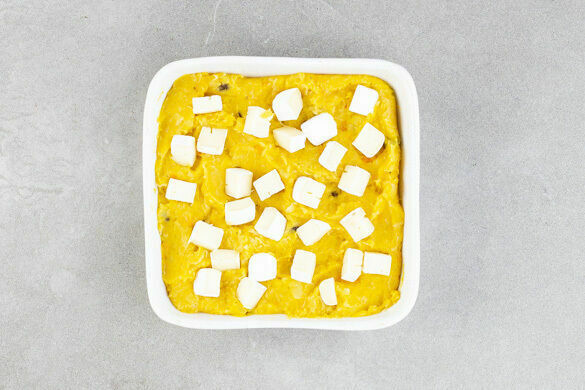 Die Masse in eine große Auflaufform geben und den Camembert darauf verteilen. Dann im Ofen 4–5Min. backen, bis der Camembert geschmolzen ist.