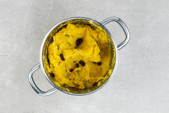 Den Kürbis und die Kartoffeln zu einem cremigen Püree stampfen, dabei nach Bedarf etwas Kochwasser hinzufügen. Das Püree mit 2EL Butter verfeinern, dann das Sauerkraut und die Rosinen untermengen und mit Salz und Pfeffer abschmecken.