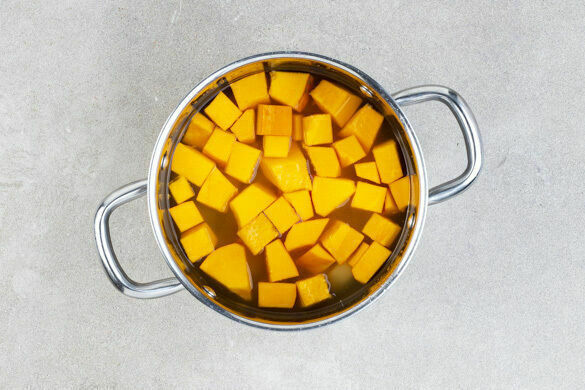 Den Kürbis und die Kartoffeln in das kochende Wasser geben und in 12–15Min. gar kochen. Mit einer Tasse etwas Kochwasser abschöpfen, dann den Kürbis und die Kartoffeln in ein Sieb abgießen und abtropfen lassen das Gemüse zurück in den Topf geben und abgedeckt warm halten.