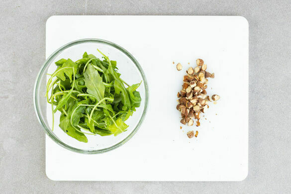 Die Rauchmandeln grob hacken. Aus 2EL Olivenöl, 2EL Balsamicoessig sowie je 1 kräftigen Prise Salz und Pfeffer ein Dressing anrühren und mit dem Rucola vermengen. Den Sauerkraut-Kürbis-Auflauf mit dem Rucolasalat anrichten und mit den Rauchmandeln garniert servieren.