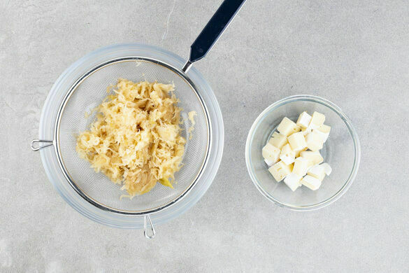 Die Camemberts in kleine Würfel schneiden. Das Sauerkraut in ein Sieb abgießen und abtropfen lassen.