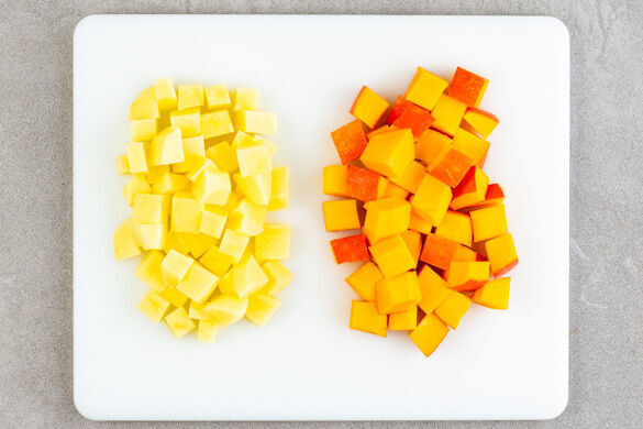 Den Backofen mit Grillfunktion oder Ober-/Unterhitze auf 230°C vorheizen. In einem mittelgroßen Topf ausreichend gesalzenes Wasser für den Kürbis und die Kartoffeln zum Kochen bringen. Den Kürbis vierteln und entkernen, die Kartoffeln schälen. Den Kürbis und die Kartoffeln in ca. 2cm große Stücke schneiden.