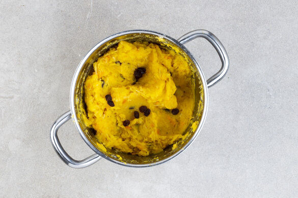 Den Kürbis und die Kartoffeln zu einem cremigen Püree stampfen, dabei nach Bedarf etwas Kochwasser hinzufügen. Das Püree mit 1EL Butter verfeinern, dann das Sauerkraut und die Rosinen untermengen und mit Salz und Pfeffer abschmecken.