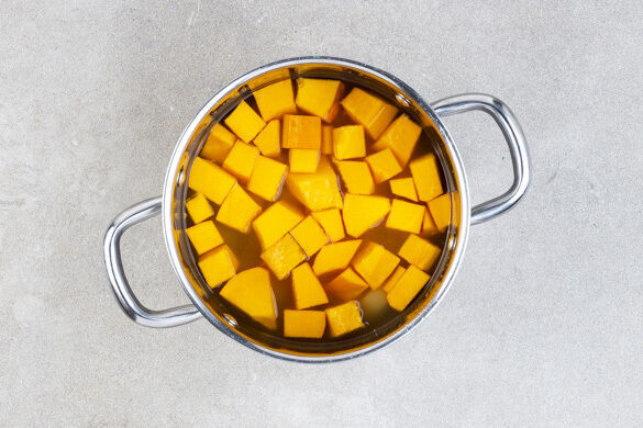 Den Kürbis und die Kartoffeln in das kochende Wasser geben und in 12–15Min. gar kochen. Mit einer Tasse etwas Kochwasser abschöpfen, dann den Kürbis und die Kartoffeln in ein Sieb abgießen und abtropfen lassen das Gemüse zurück in den Topf geben und abgedeckt warm halten.