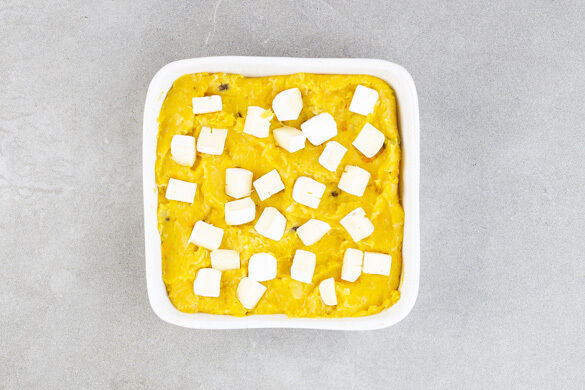 Die Masse in eine mittelgroße Auflaufform geben und den Camembert darauf verteilen. Dann im Ofen 4–5Min. backen, bis der Camembert geschmolzen ist.