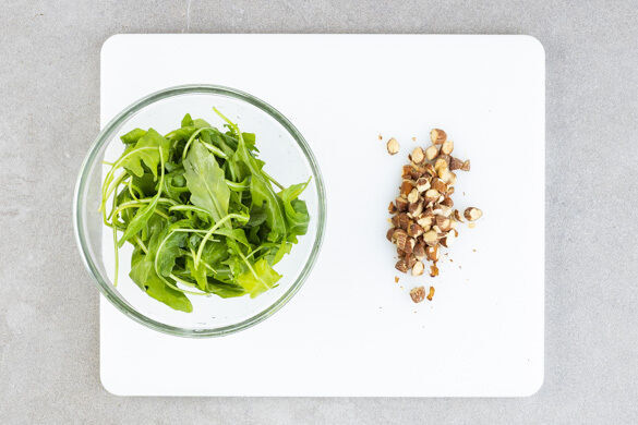 Die Rauchmandeln grob hacken. Aus 1EL Olivenöl, 1EL Balsamicoessig sowie je 1 Prise Salz und Pfeffer ein Dressing anrühren und mit dem Rucola vermengen. Den Sauerkraut-Kürbis-Auflauf mit dem Rucolasalat anrichten und mit den Rauchmandeln garniert servieren.