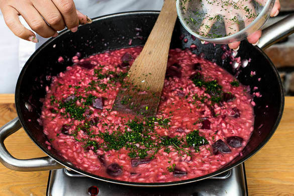 Die Rote Bete dazugeben und alles gut verrühren. Dann die restliche Brühe dazugeben und den Reis in 3–5Min. fertig garen.