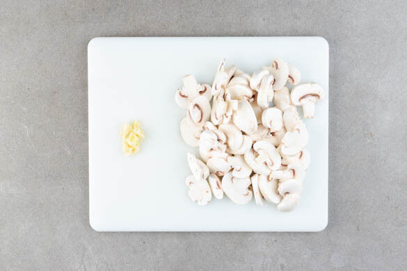 Den Knoblauch schälen und sehr fein würfeln oder durch eine Knoblauchpresse drücken. Die Pilze ggf. säubern und in Scheiben schneiden.