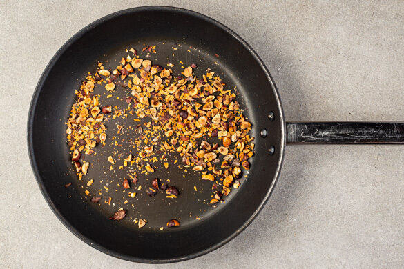 In einem mittelgroßen Topf ausreichend gesalzenes Wasser für die Spätzle zum Kochen bringen. Die Haselnüsse grob hacken und in einer großen Pfanne ohne Zugabe von Fett bei mittlerer Hitze 1–2Min. goldbraun anrösten. Vorsicht, sie können schnell zu dunkel werden. Zum Abkühlen aus der Pfanne nehmen und beiseitestellen.